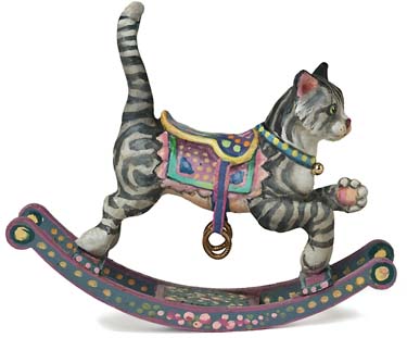 A tabby cat cast in metal on wooden runners. Molded saddle with brass stirrups.