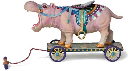 A hippo cast in polymer on a wooden platform. Leather saddle, metal wheels, and brass stirrups.