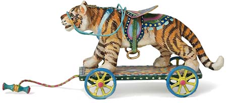 A tiger cast in polymer on a wooden platform. Leather saddle, metal wheels, and brass stirrups.