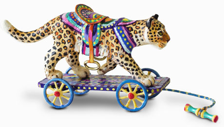 A leopard cast in polymer on a wooden platform. Leather saddle, metal wheels, and brass stirrups.