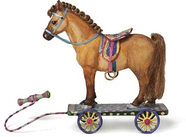 A small buckskin horse on a wooden platform. Leather saddle, metal wheels, and brass stirrups.