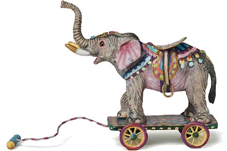 An elephant cast in polymer on a wooden platform. Leather saddle, metal wheels, and brass stirrups