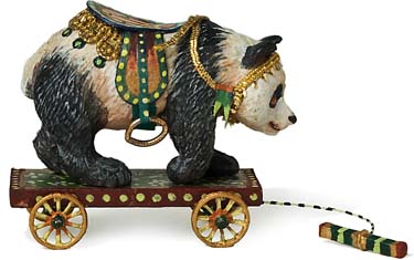 A panda bear cast in metal on wooden platform. Leather saddle and brass stirrups.