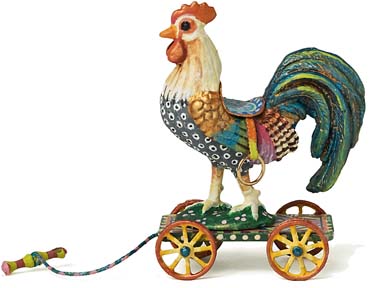 A rooster cast in metal on a wooden platform. Leather saddle, metal wheels and brass stirrups.