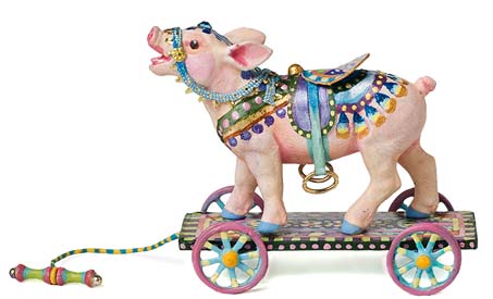 A Piglet cast in polymer on a wooden platform. Molded saddle and brass stirrups.