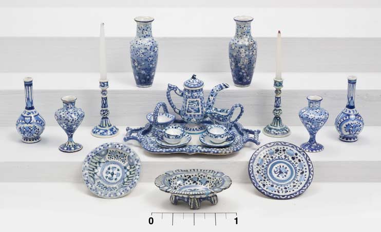 My “porcelain” pieces are inspired by original Asian or English patterns. Most are made of brass or pewter; base coated, hand painted and glazed. However, the tureen and some of the bowls are bisque. All the pieces are in 1/12th scale.