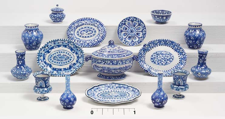 My “porcelain” pieces are inspired by original Asian or English patterns. Most are made of brass or pewter; base coated, hand painted and glazed. However, the tureen and some of the bowls are bisque. All the pieces are in 1/12th scale.